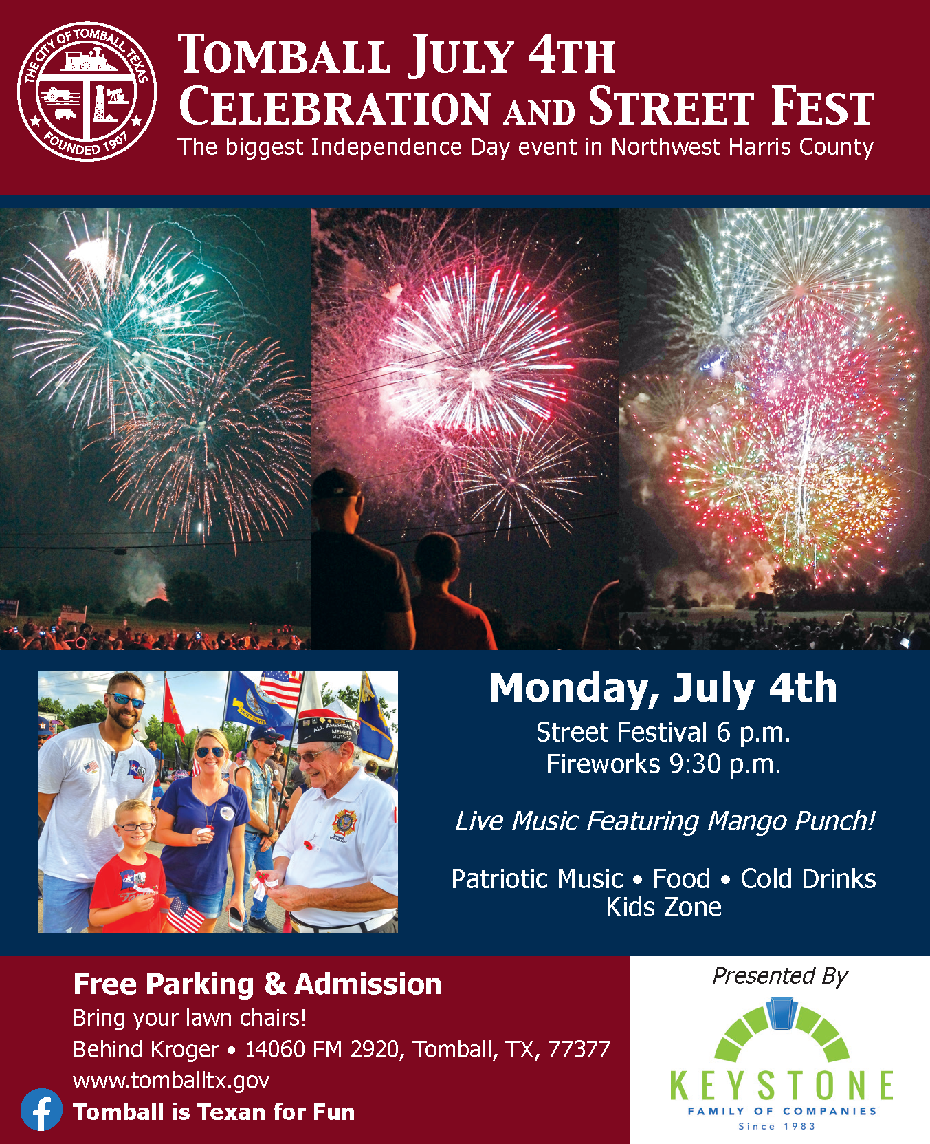Business Highway 249 north of FM 2920 behind Kroger will shut down for the annual celebration as the street fills with live music, food vendors and a Kid’s Zone. Houston Press Music Award winner, and Super Bowl pre-game entertainers, “Mango Punch!” featuring Walter Suhr, will be the main entertainment. This high-energy party band will perform tunes from salsa to classic rock, country and more, starting at 6 p.m. A special tribute to veterans and active-duty military will be also held with a sing-along of traditional patriotic tunes honoring the USA led by local entertainer Valerie Hill.
