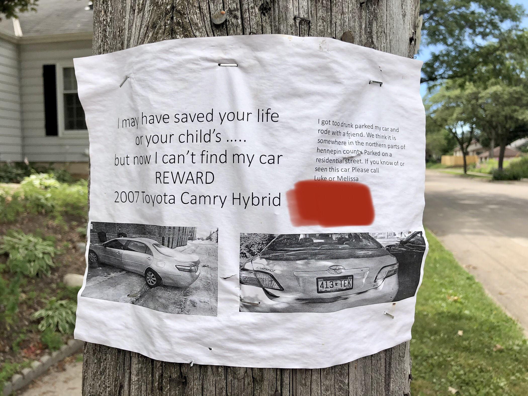 Someone in Minnesota has been posting signs all over north Minneapolis after they got drunk . . . decided to ride home with a friend . . . and can’t remember where they parked their car.