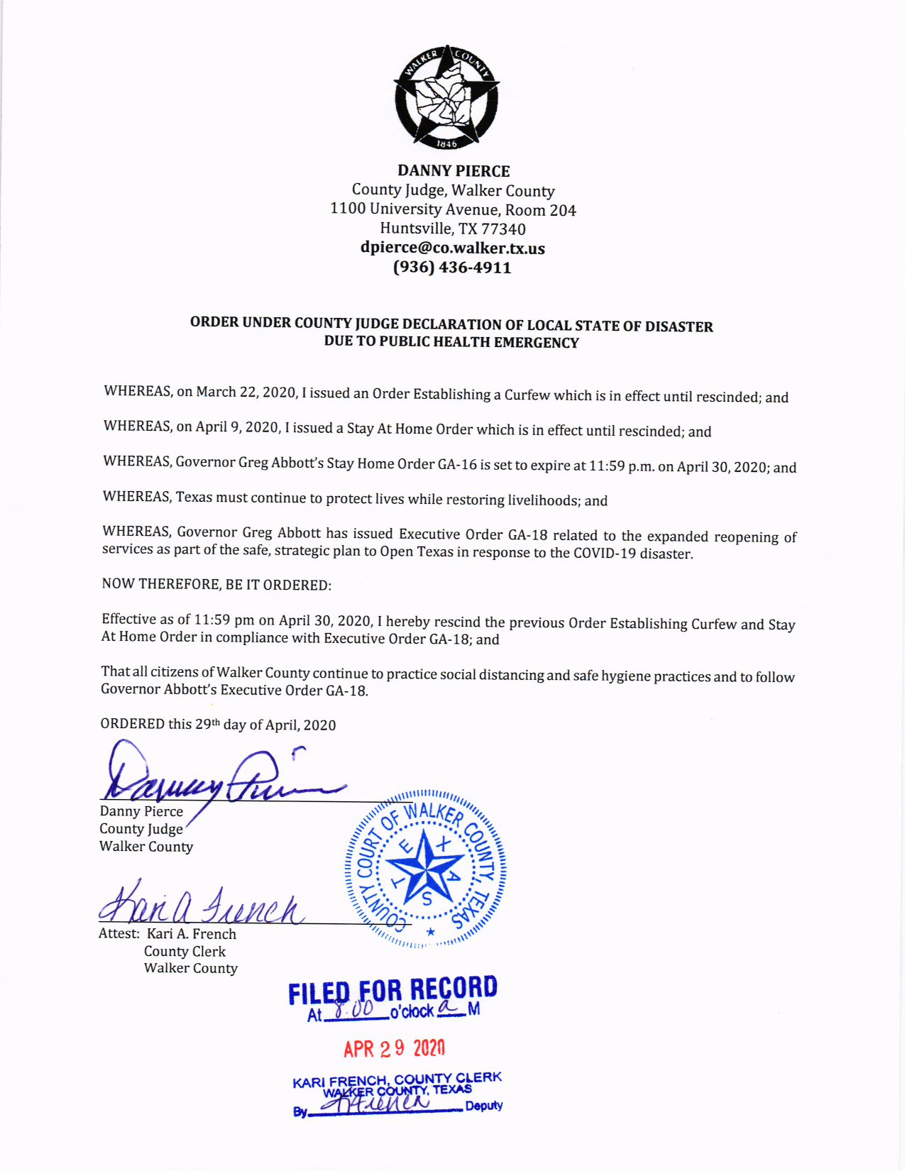 Walker County Rescinds Curfew and Stay at Home Order
